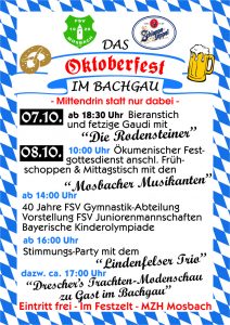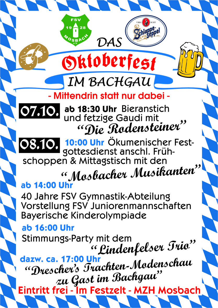 Der FSV Mosbach veranstaltet auch in diesem Jahr, „Das Oktoberfest im Bachgau“ – das größte Fest, dieser Art in unserer Region. Den Gästen aus nah und fern wird auch in diesem Jahr wieder ein tolles Wochenende im bayerisch geschmückten „Wohlfühlzelt“ geboten. Wer die Seele baumeln lassen, kräftig feiern, sich kulinarisch verwöhnen lassen, die „Original-Oktoberfest-Stimmung“ und das vielfältige Programm genießen möchte, sollte den Weg nach Mosbach finden. Das diesjährige Oktoberfest steht unter dem Motto: „MITTENDRIN STATT NUR DABEI“