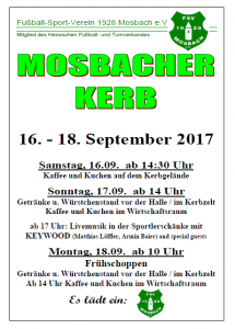 Besuchen Sie vom 16. – 18.09.2017 unsere Moschbacher Kerb. Für die Kleinen wie immer mit Autoscooter, Karussell und vielem mehr, während die Eltern gemütlich bei einem kühlen Getränk oder etwas zu essen die Kerb feiern können.